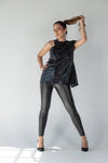 This black crocodile leather top is light, sexy, and perfect for a night out or a date. With a unique twist, the long black zipper down the back adds an unexpected, daring detail that sets this top apart in an elegant way